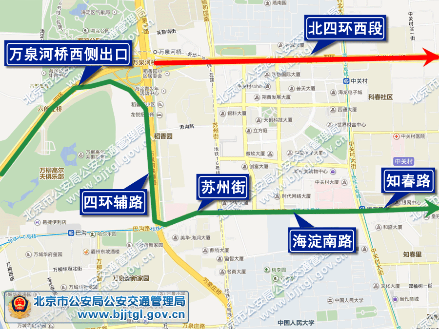 当北四环西段西向东方向车行缓慢时,过境车辆可根据实际情况,从万泉河桥西侧出口驶出,经四环辅路、苏州街、海淀南路绕行知春路;