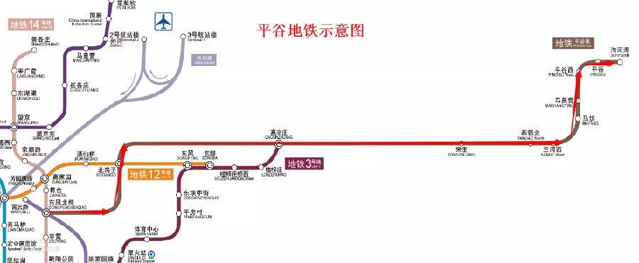 6.平谷线:初步研究东起平谷区,经河北省三河、燕郊进入通州区宋庄区域,再向西进入朝阳区,在东坝北区北侧经规划亮马河北路至东四环终点,与地铁14号线在东风北桥实现换乘;全部为地面及高架线,共设11座车站。
