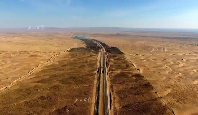 ▲在穿越沙漠路段,都有鳍形沙袋防风固沙,并且建有动物迁徙通道