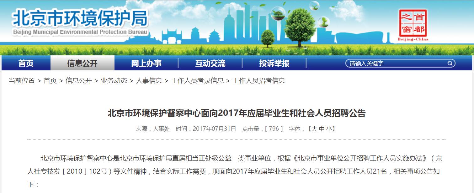 招聘工作人员21名(详见《北京市环境保护督察中心公开招聘岗位需求表》http://www.bjepb.gov.cn/bjhrb/xxgk/ywdt/rsxx/gzryklxx96/gzryzkxx/817117/index.html)