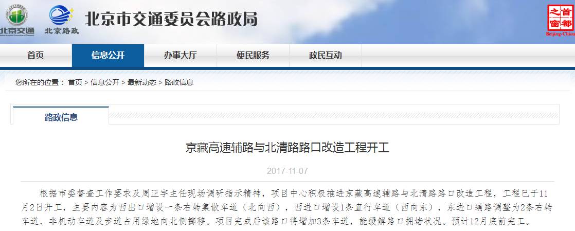 11月7日,北京市交通委员会路政局官方网站发布了一则有关京藏高速辅路与北清路路口改造工程的信息:
