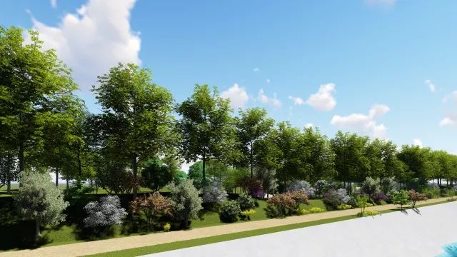 效果图:艳阳普照、绿荫掩映下的南侧公共绿地
