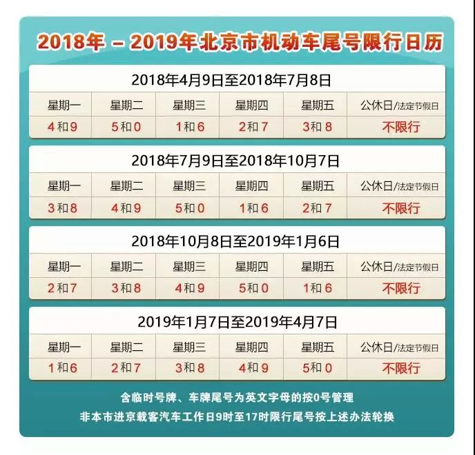 ⛳ 自2018年4月9日至2018年7月8日,星期一至星期五限行机动车车牌尾号分别为:4和9、5和0、1和6、2和7、3和8(机动车车牌尾号为英文字母的按0号管理,下同);