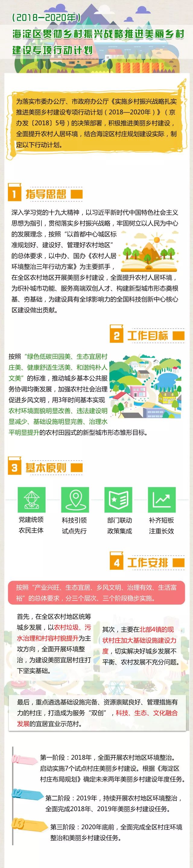 为落实市委办公厅、市政府办公厅《实施乡村振兴战略扎实推进美丽乡村建设专项行动计划(2018—2020年)》(京办发〔2018〕5号)的决策部署,积极推进美丽乡村建设,全面提升农村人居环境,结合海淀区村庄规划建设实际,制定《海淀区贯彻乡村振兴战略推进美丽乡村建设专项行动计划(2018-2020年)》。