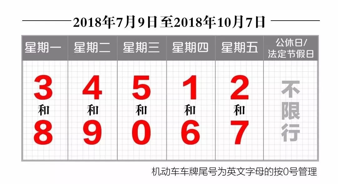 根据市政府发布的通告,自2018年7月9日至2018年10月7日,星期一至星期五限行机动车车牌尾号分别为:3和8、4和9、5和0、1和6、2和7。机动车车牌尾号为英文字母的按0号管理。