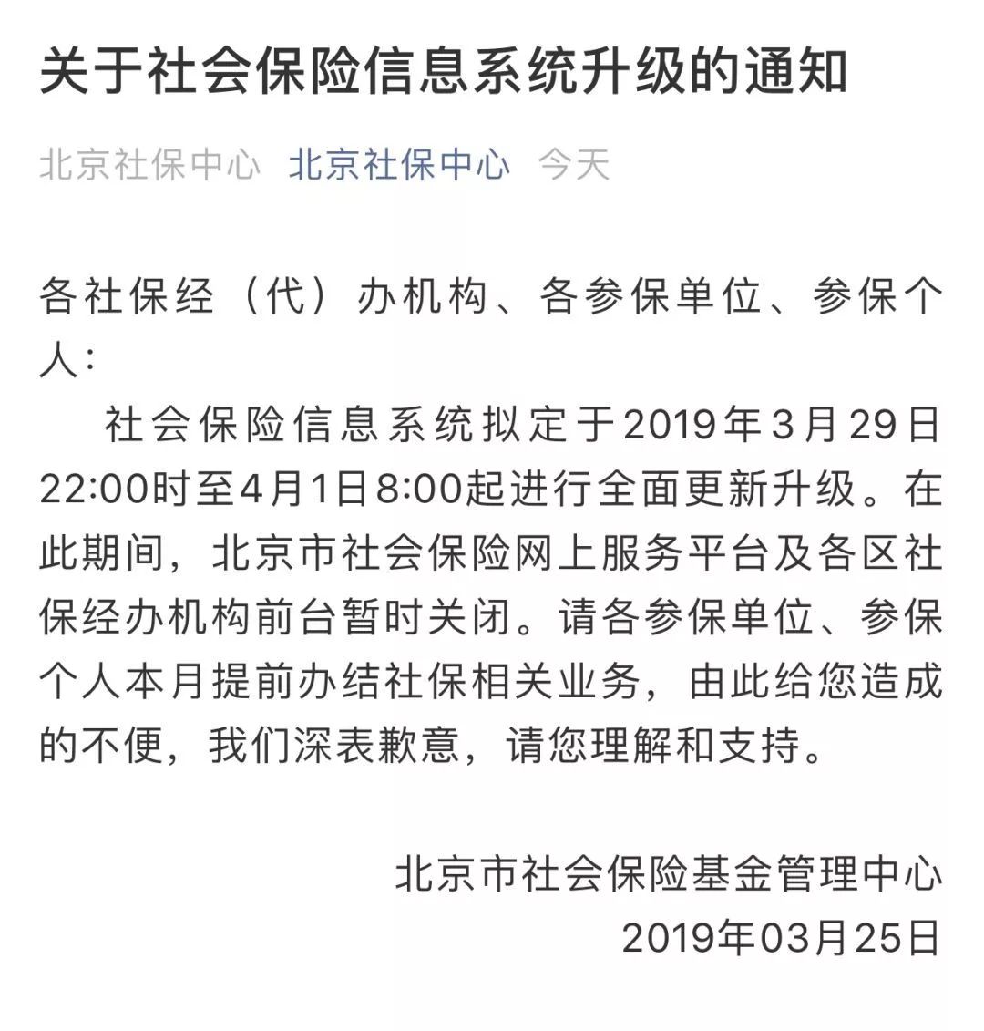 日前,北京社保中心发布消息社保系统将关闭升级: