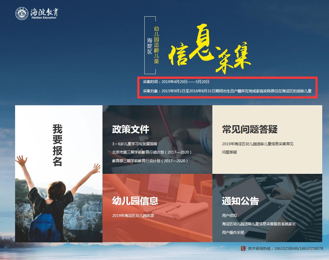 4月20日至5月20日,海淀区适龄幼儿家长可登陆“海淀区幼儿园适龄儿童信息采集系统”进行信息采集,每日采集时间为早7:30至晚22:00。