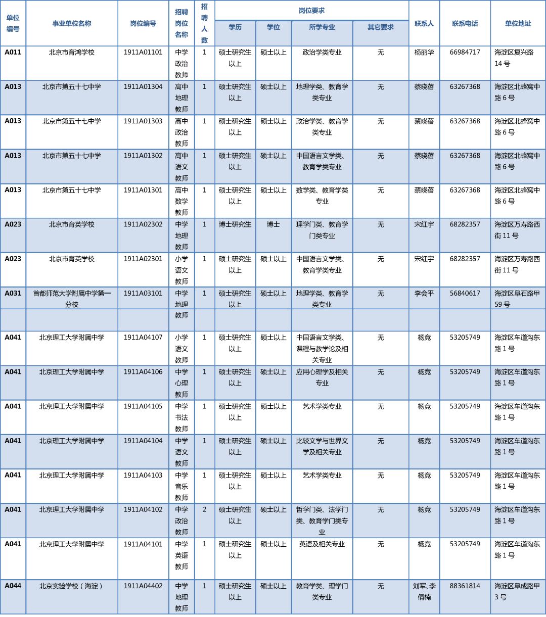 2019年海淀区教委所属事业单位第一次(面向毕业生)公开招聘工作人员岗位需求表