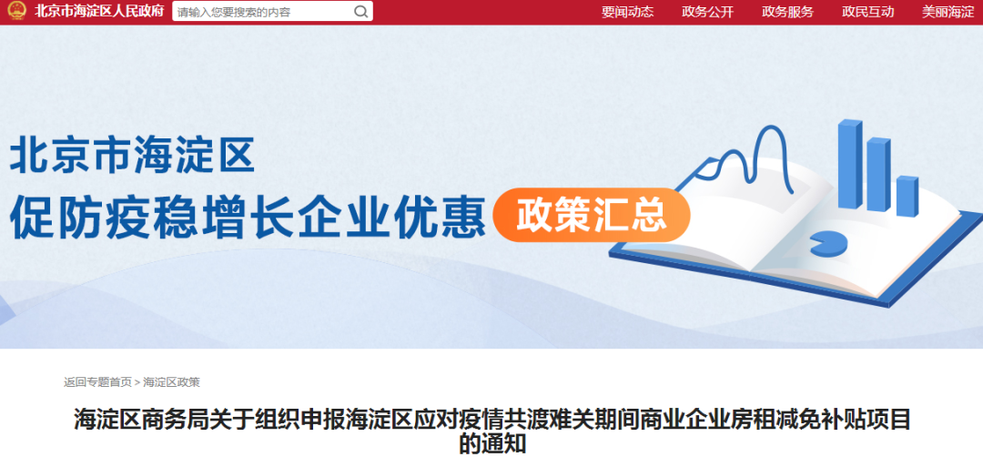 为充分发挥财政专项资金疫情防控期间对我区商业服务业企业的扶持作用,帮助企业共渡难关,解决企业经营困难,根据《北京市海淀区人民政府关于印发本区落实北京市促防疫稳增长政策加大力度支持企业稳定发展若干措施的通知》、《海淀区提升消费能级提高生活品质三年行动计划(2019—2021年)》和《海淀区进一步促进消费能级提升发展支持办法》的文件精神,现将申报海淀区应对疫情共渡难关期间商业企业房租减免补贴项目通知如下: