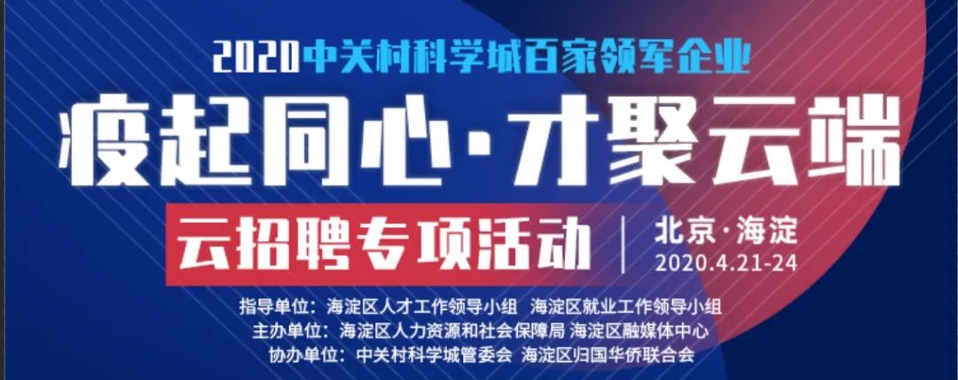 【活动预告】为落实好海淀区统筹推进“六稳”工作及“后疫情”时期经济发展的有关措施,全力保障中关村科学城领军企业,特别是平台企业的用人需求,4月21日,海淀区人力社保局将联合相关单位正式启动主题为“疫起同心,才聚云端”的2020中关村科学城百家领军企业云上招聘专项活动。