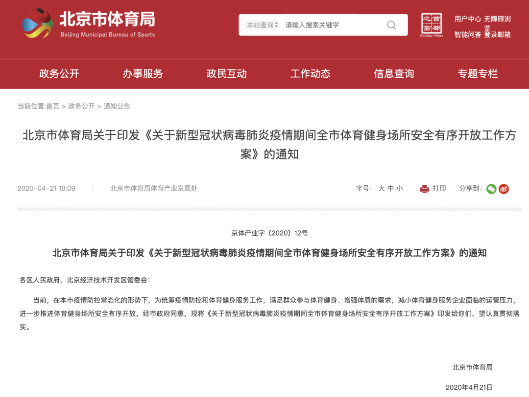 21日晚,北京市体育局官网发布了关于印发《关于新型冠状病毒肺炎疫情期间全市体育健身场所安全有序开放工作方案》(下称《方案》)的通知,明确:即日起,将推进室外、室内体育健身场所有序安全开放。