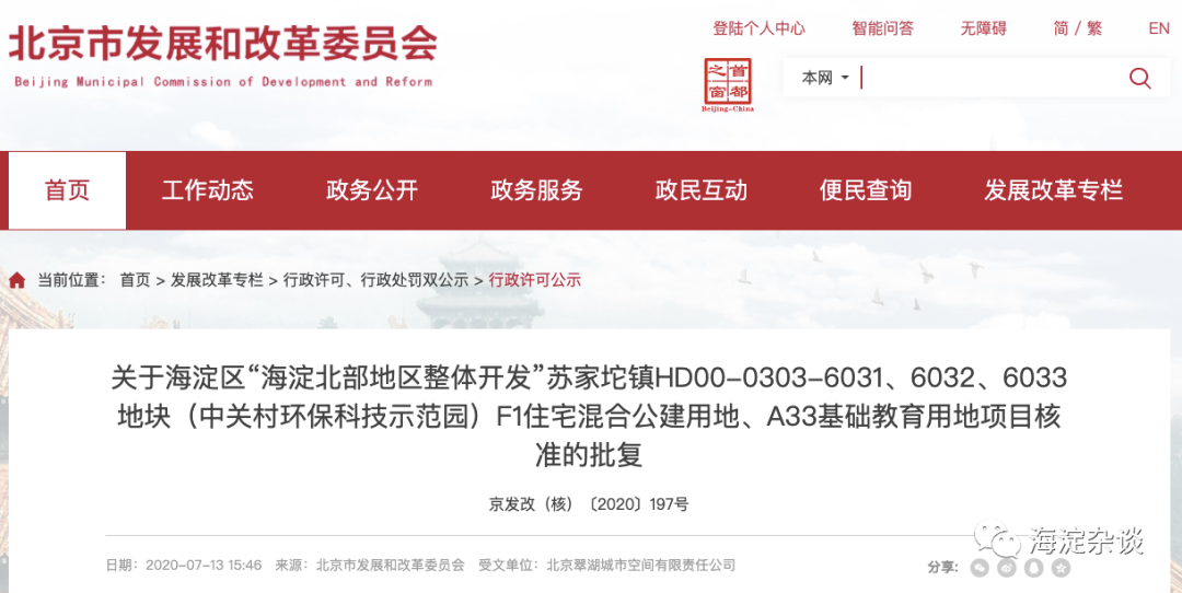 今天和大家分享海淀北部发展的新消息,日前,市发改委网站信息显示:海淀区“海淀北部地区整体开发”苏家坨镇HD00-0303-6031、6032、6033地块(中关村环保科技示范园)F1住宅混合公建用地、A33基础教育用地项目获得核准批复,这意味着项目已经取得立项。