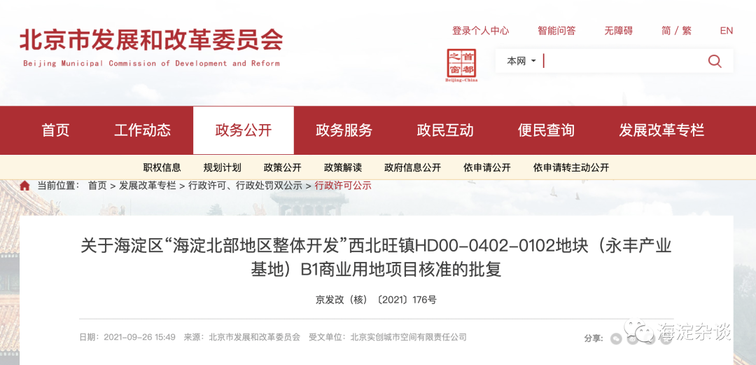9月26日,市发改委就海淀北部地区整体开发”西北旺镇HD00-0402-0102地块(永丰产业基地)B1商业用地项目核准批复发出公示。