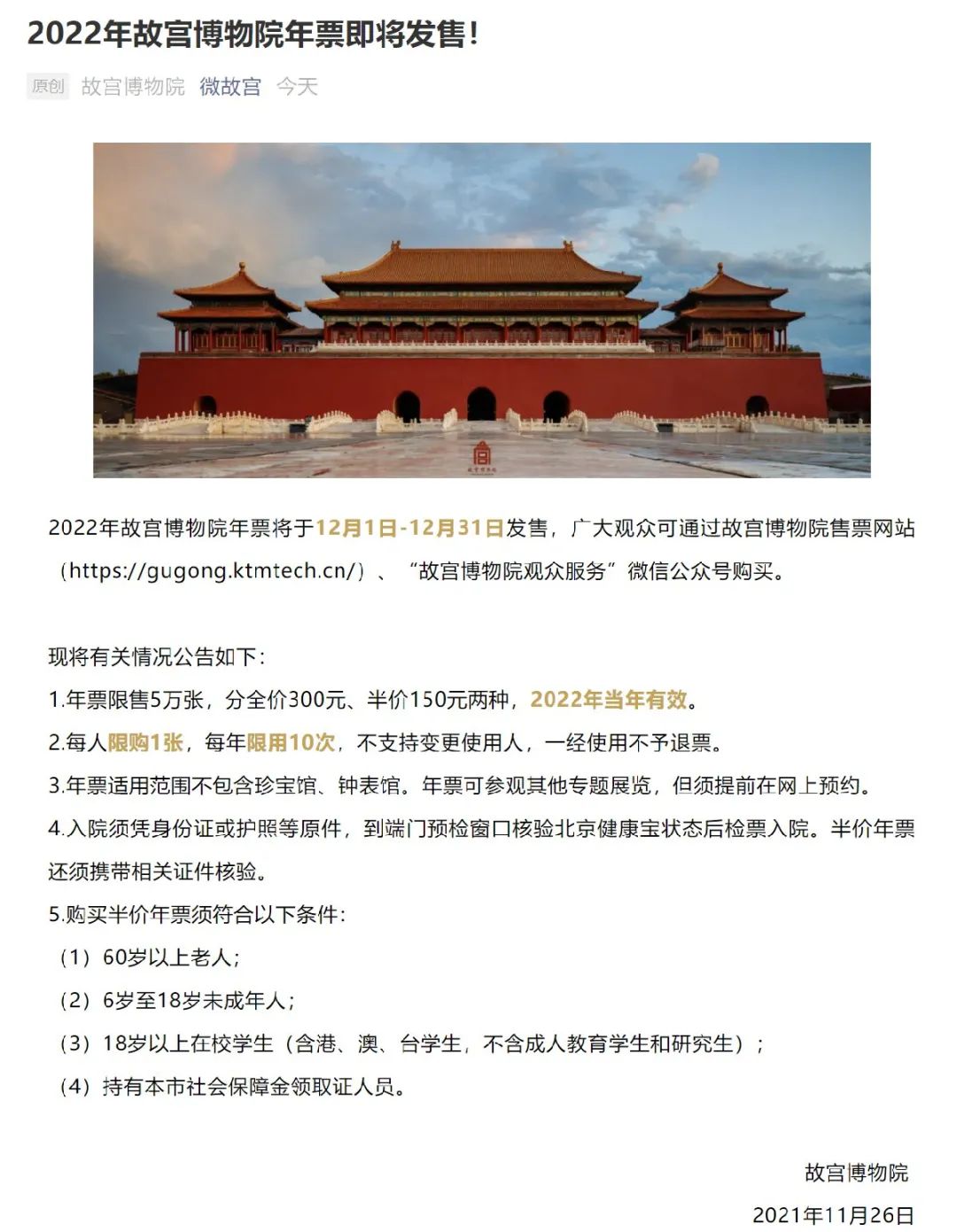 未经允许不得转载:海淀北部便民平台 » 2022年故宫博物院年票下月发售 限售5万张全价300元