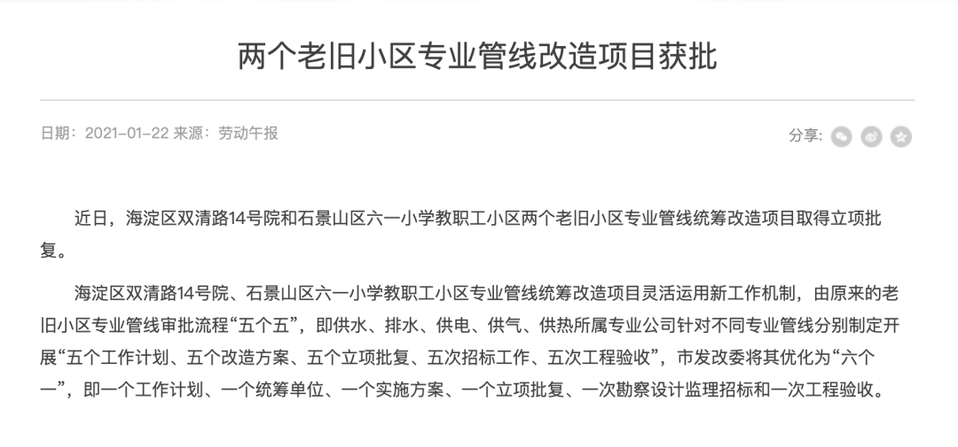 “这个试点项目的实施不仅可进一步改善百姓居住环境,增强群众的获得感、幸福感、安全感,而且为更多老旧小区专业管线统筹改造探明了一条一站式改造的新路径。”相关负责人说。未来,北京市发改委将进一步推动“六个一”机制落地,总结试点经验并复制推广,惠及更多老旧小区。
