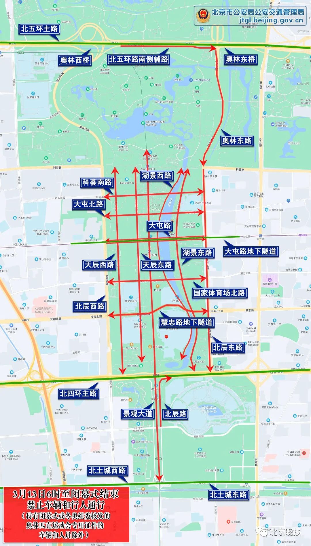 今日19时至闭幕式结束,北土城西路(北辰西路南口至北土城路口)、北土城东路(北土城路口至小关路口)、鼓楼外大街、北辰路,除持有闭幕式或冬奥组委核发的奥林匹克运动会专用证件的车辆和人员外,禁止其他车辆和行人通行。