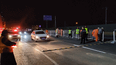 路口处,手举闪光指挥棒的工作人员