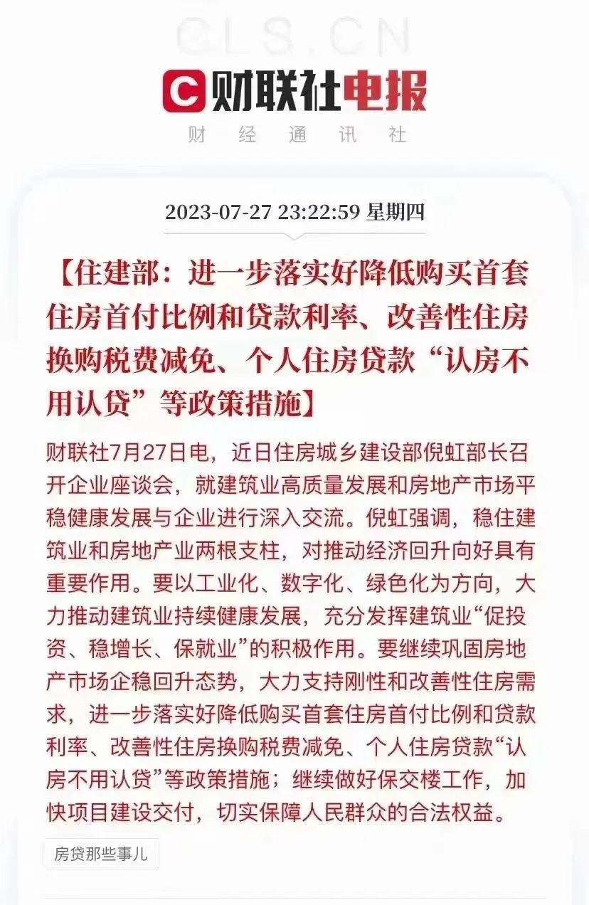 财联社7月27日电,近日住建部部长发话,要求稳住房地产业,进一步落实好降低购买首套住房首付比例和贷款利率,个人住房贷款“认房不用认贷”等政策措施。